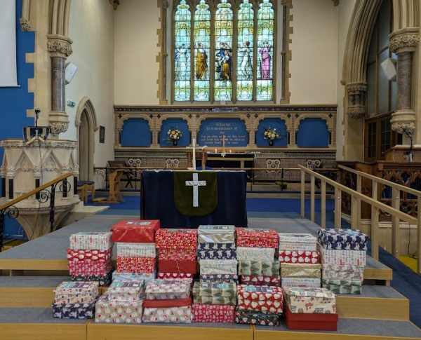 Today at Trinity, the shoeboxes prepared by the Friendship Group and the Thursday Group, co-ordinated by Lindsey, were blessed in a moving moment during the morning service by Revd Nigel Ogley.